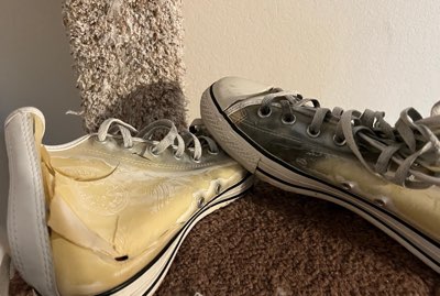 While organizing, I had to say goodbye to the above pair which I had nicknamed the Andy Warhol Factory set. They lasted just a mere 12 years and I probably wore them maybe 30 times. Sadly, the plastic they were made from wasn’t easy to clean (I never bothered) and as you can see, not durable. I fear my socks transferred the bacterial stuff we all have living on our feet to the materials…and, the bacteria ate the plastic. Going to miss them.