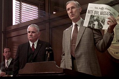 It may be the early Fifties and what these dirty cops did was par for the course (even today, especially in NYC, LA and Chicago)…unless its exposed by the Media. LA’s DA and Police Chief Parker have to punish the culprits with a trial. Exley gladly testifies against the advice of his immediate superior Captain Smith; Blue Lives Matter = Cops who rat out other Cops are traitors. Exley isn’t stupid nor naive, in exchange for his testimony, he gets the Chief to promote him to Homicide and the rank of Detective Lieutenant. Vincennes is forced to cooperate since the DA needs at least two officers to corroborate and Exley provides the means to the Parker to make it happen: his TV consultancy. Vincennes agrees to do it as Parker just hands him brief suspensions from the show and a short-term transfer to to Vice but he’ll be back in Narcotics within a year. White is suspended indefinitely while Stensland is fired with his pension revoked. So many cops want to kill or disgrace Exley.