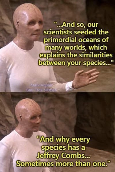 The additional joke is the awesome actor Jeffrey Combs has been in at least three of the shows (DS9, Enterprise and Lower Decks) as the Andorian Shran, two Ferengi, an evil AI and the cloned Vorta Weyoun. He’s just a great actor and he’s probably patient with sitting in a makeup chair.