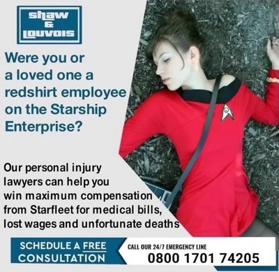 Very funny and clever bit yet I think it was written in the UK since US/CAN-based phone numbers are only 10 digits plus toll free starts with just 1 or 800. The pranksters definitely nailed it on the woman’s hair. As for the joke about redshirts, I enjoy it to a point even if it is lazy since crew members of all the uniform colors bit the dust back in the Sixties, just the nature of TV in those days. Besides, why sue just the Enterprise, there are even more solid cases involving the starships lost with all hands: Constellation, Exeter, Intrepid and Defiant readily come to mind. Then survivors can sue the Daystrom Institute for the deaths caused by the M-5 computer’s test run during war-games against Excalibur and Lexington. Sad how I can remember such useless crap immediately.