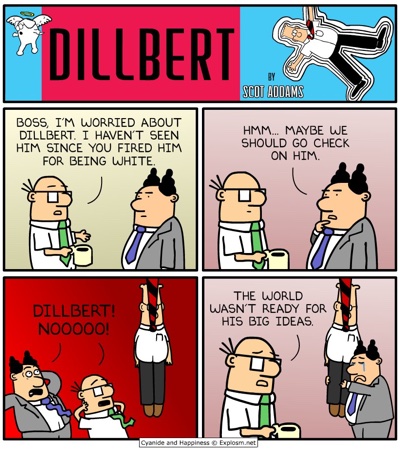 We know he’s crying crocodile tears too. The real pity is that Al Capp (the racist behind Lil’ Abner) isn’t around to provide advice on the next career step. Adams made enough cash from all his licensing which is how you get rich from a daily strip; notice how there wasn’t any official Calvin & Hobbes. Now all those wall and desk calendars are going to disappear (into the trash) while there will probably be a selloff blitz of those collections at our nearby Half-Priced Books. Such a bummer. I used to enjoy Dilbert but I was still young and not as familiar with the tropes of office/white collar life. However, it probably stopped being funny as per other comedies that didn’t age well (SitComs, SNL skits) plus I think there’s a limit on how many jokes or gags can be formulated via Dilbert‘s premise. Right alongside with how boring it has been when Dagwood is kicked in the ass by his boss or eats a giant sandwich. Let’s hope Gary Larson has no strong opinions about anything!