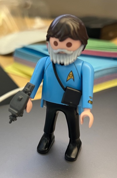 Introducing Lt. Commander Maggi. Chief Astronomy Officer and vice-Counselor on the Enterprise! Thanks to Playmobil producing a four-pack of the Star Trek characters, I was able to take its McCoy and modify it with another figure to make…me! As my hair grays, I will be modifying it to match. I wish I had more skill at painting and drawing at such a tiny, tight scale. I would prefer to be assigned to the Farragut which has a different badge as per tradition on Constitution-class starships.