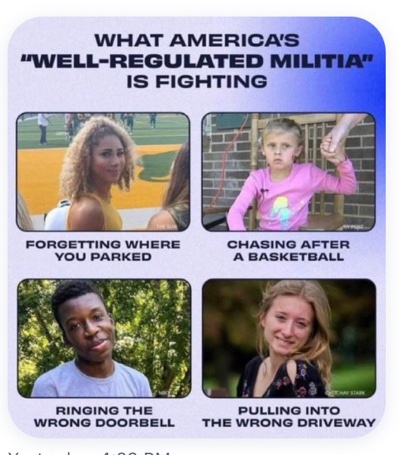One of these “misfires” happened nearby too, the cheerleaders who accidentally got into the wrong car tragedy. What makes it even worse, the ammosexual got out of his vehicle to shoot the young lady. That’s not defensive, that’s murder as there was intent. So much for the well-regulated militia bullshit these NRA assclowns are promoting.