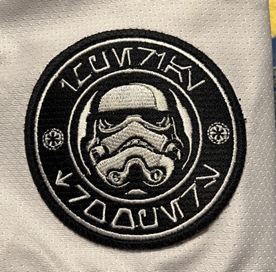 The final touch I love are the patches on the shoulder. I obviously have a ‘translation’ of the Aurebesh characters; OK, it’s not a translation, more of a lazy cypher or character sub they’ve had since the first movie. “Imperial Troopers.” Drat. I was hoping for a little joke as my Mars University shirt has.