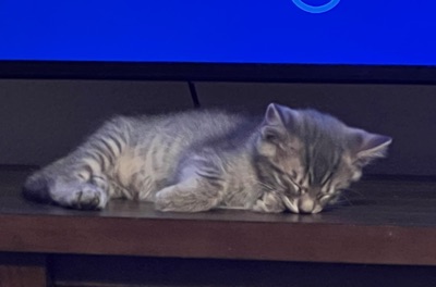 It’s not a surprise to those who know their cats. Kittens are notorious for falling asleep in the middle of fighting each other, eating meals and most often, in our laps. Remus has recently discovered all the motion on our TV. He hops up to swat at any motion spotted since his eyes aren’t developed enough to make out what exactly is on the screen. After his exhaustive workout, he collapsed right below the TV! Remus is so adorable. I’m going to miss the little booger as it’s about time he, his brother Romulus and mother Rhea return to AHS for surgery and adoption.
