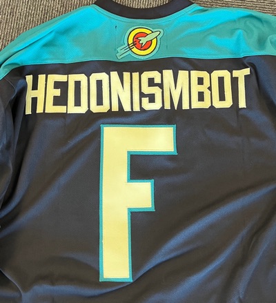 My third Geeky Jersey based upon Planet Express arrived yesterday! Coincidence? I think not! It’s also just in time for the new season on Hulu in about 11 days. Why the ‘number’ F? For us computer-related workers, F = 15 in hexadecimal, one of the two numerical systems computers and eventually, robots, understand. I had to keep the tradition since I’ve bored you all on my Bender jersey having 6C1 (1729). Given Hedonismbot being the purveyor of X-rated activities in the show, you probably thought I chose F to be a placeholder for the F word. Nope, too lazy and not very bright. I chose 15 as his number because it’s the number representing excessive appetites and desires, to some extent hedonism. It did when I put the order in a few months ago. Now my stupid Google searches keep turning up crap about angels and marriage. Trust me, I did my homework much like I did with 17 for Vizzini or my upcoming 27 for Rotwang.