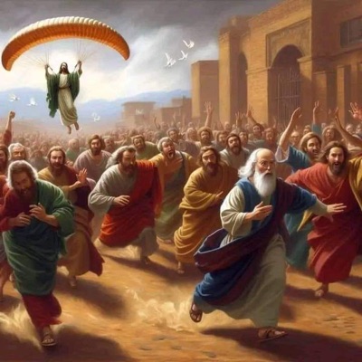 Wait! I just thought another. This is an artist’s rendition of the first Black Friday Sale and Jesus is paragliding to get ahead. Even the messiah wants to save a few gold aurei when it comes to high quality, Gvcci Sandals.