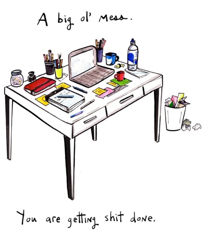 A paraphrasing from the cheesey bit about sane v. crazy people or how left-handers are the only people in their “right” mind. I do clean up the clutter every few weeks at my work. For home, I have yet to get a stronger handle on it.