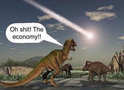 I need to have this handy for all the dickheads, usually right-wing economists and their flunkies, when they attack the Green New Deal or environmental legislation that allegedly kills jerbs! None of it will matter if we’re dead and/or slowly dying of cancer or heatstroke. Whenever you watch a Post Apocalyptic stories such as Mad Max 2-3, The Omega Man or The Walking Dead, never do you hear (nor see) some MBA type expressing their worries over the Economy! Thankfully, they were killed before the show started!