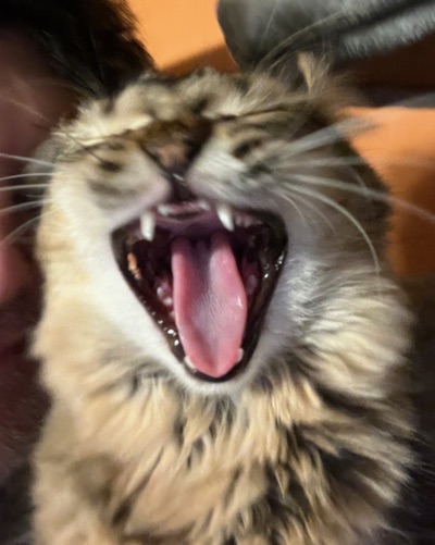 This picture of us together for the cat slack channel was ruined by her yawning and the cloud of cat-food fueled stench. Klothos is a cute little creature yet her breath punches up to the adult level. Good thing she is adorable and exotic, it helps everyone forget. Unless she emits a memory-loss gas.